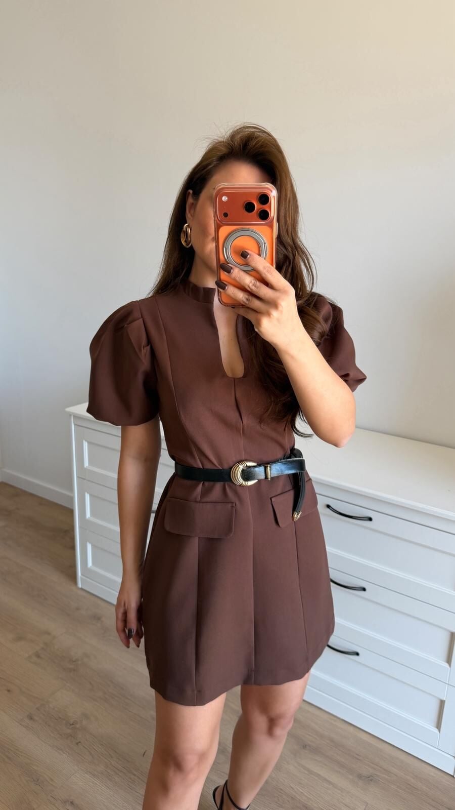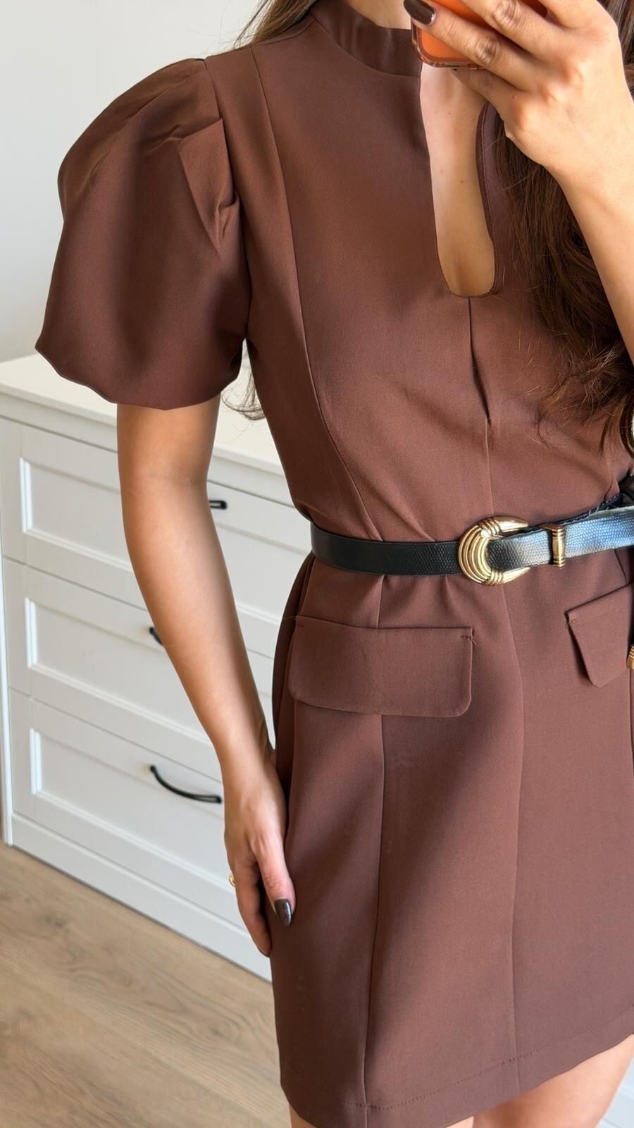 Balon Kol Mini Kahve Elbise