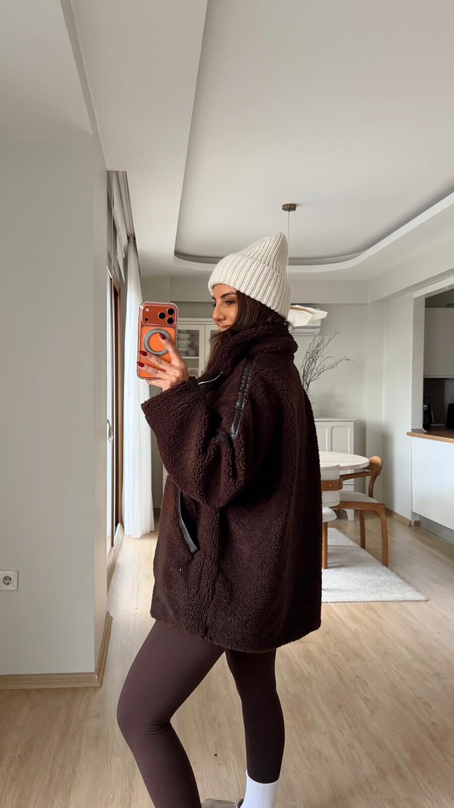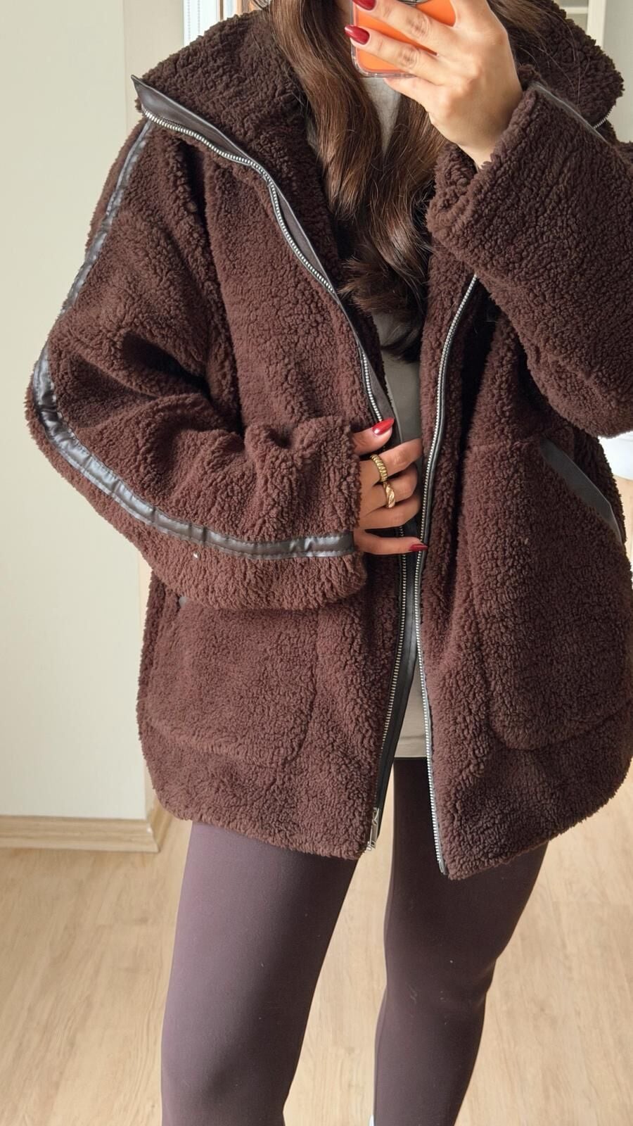 Deri Detaylı Peluş Ceket Kahve