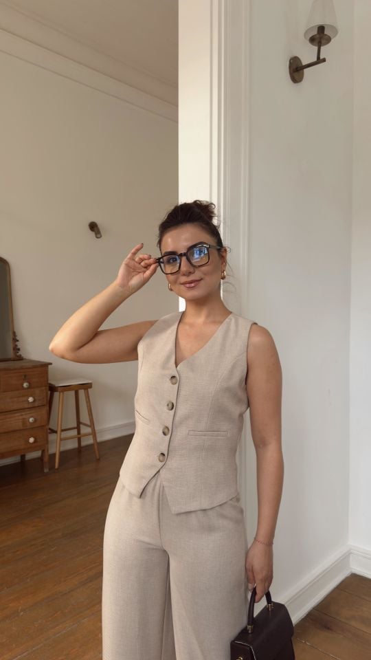 Dokulu Düğmeli Yelek Bej