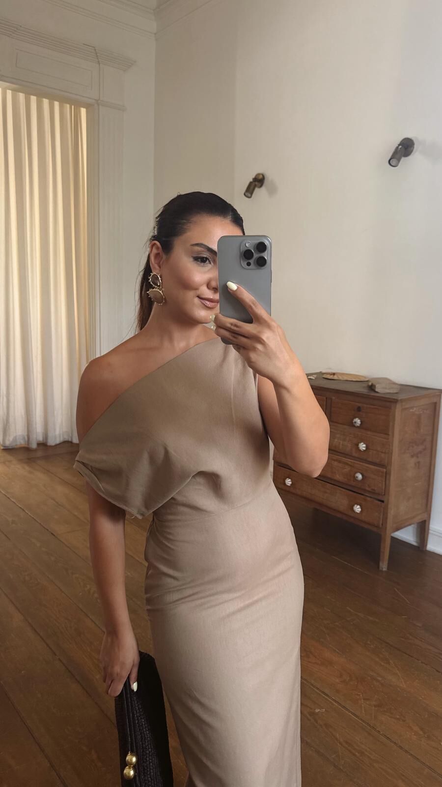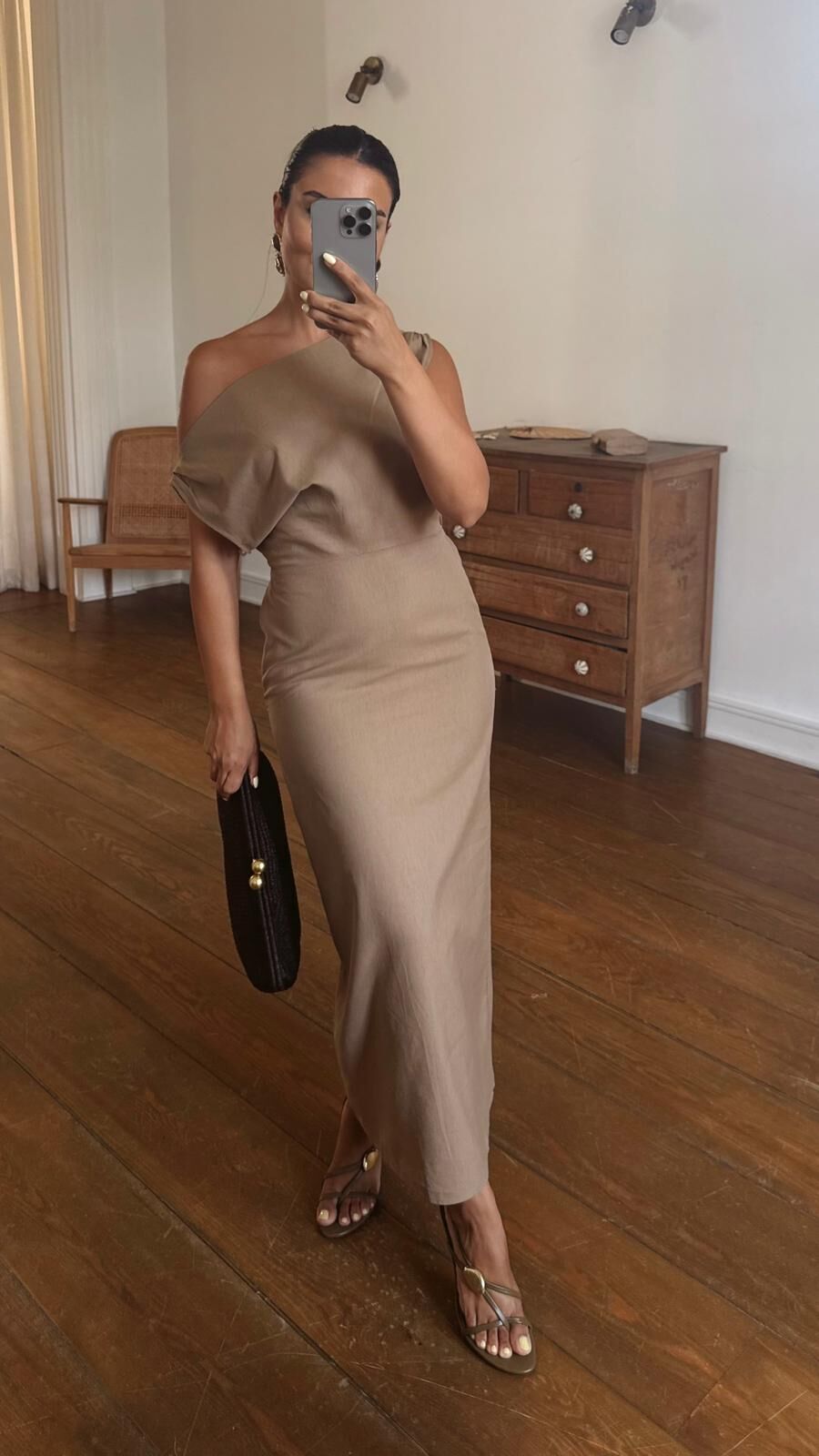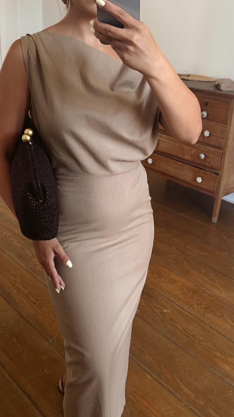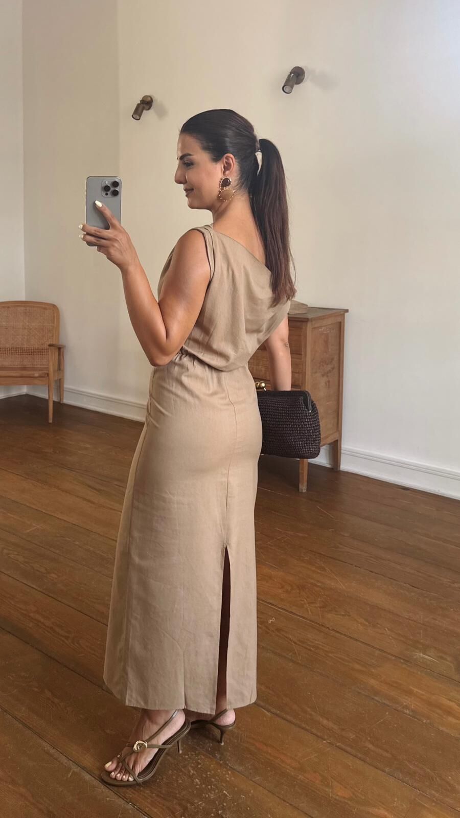 Düşük Kol Keten Elbise Camel