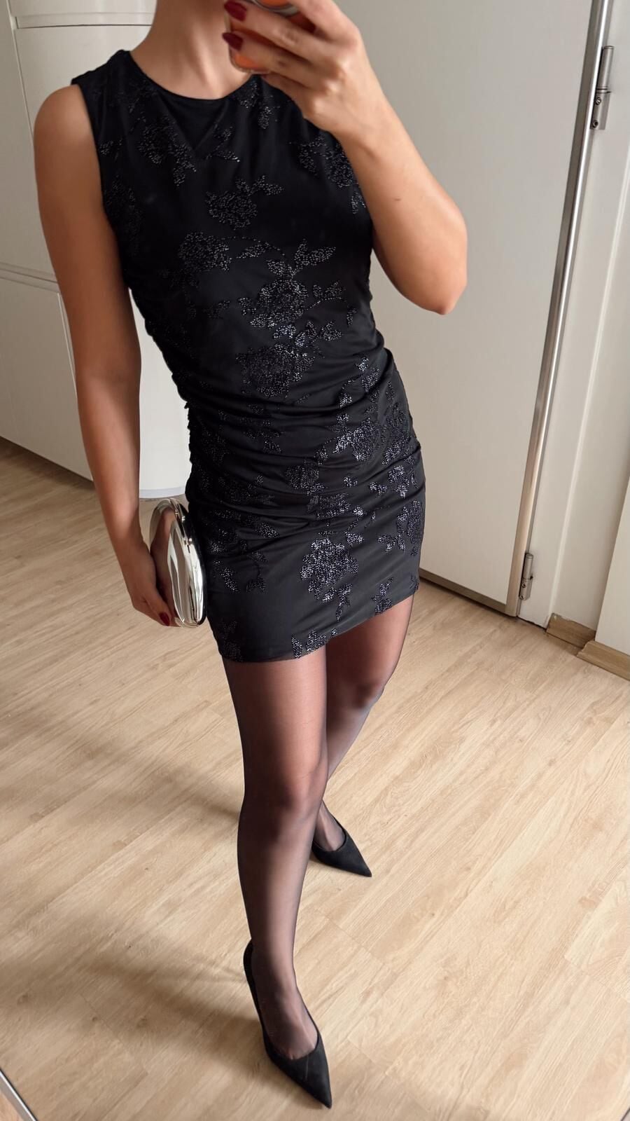Kadife Baskı Drapeli Elbise Siyah