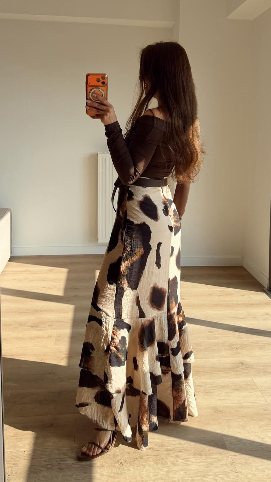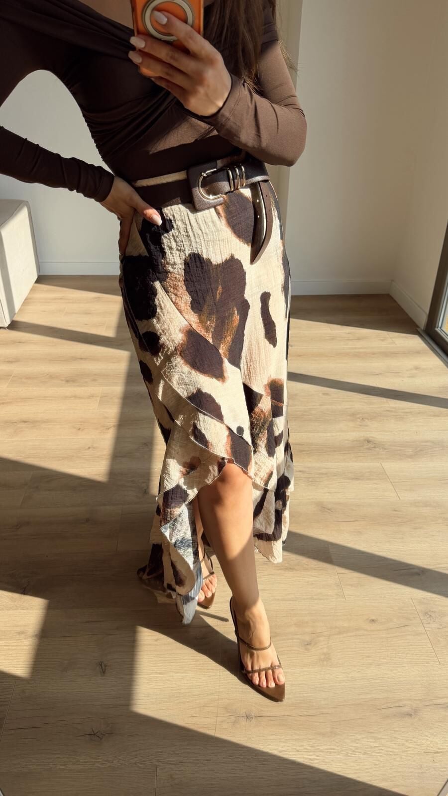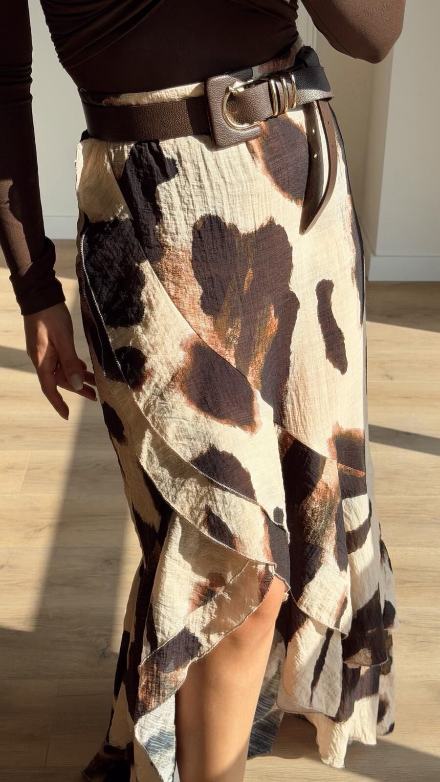 Kahve Desenli Volanlı Etek