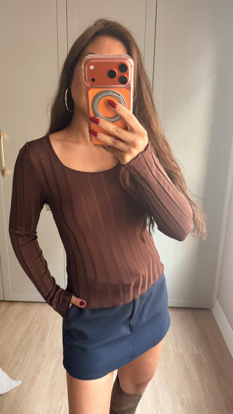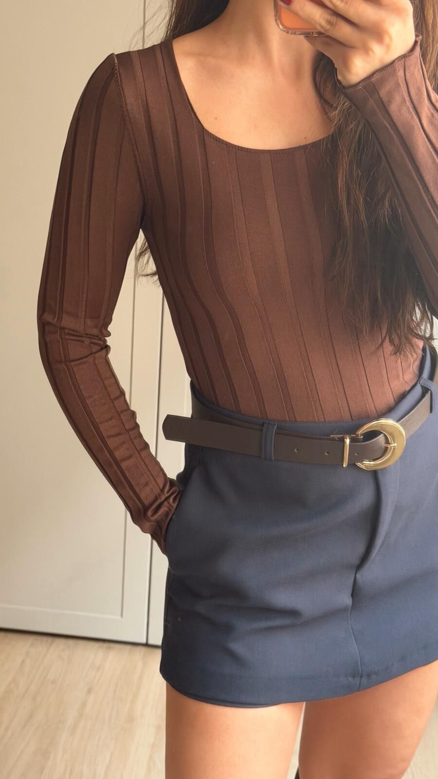 Kare Yaka Dokulu Triko Kahve