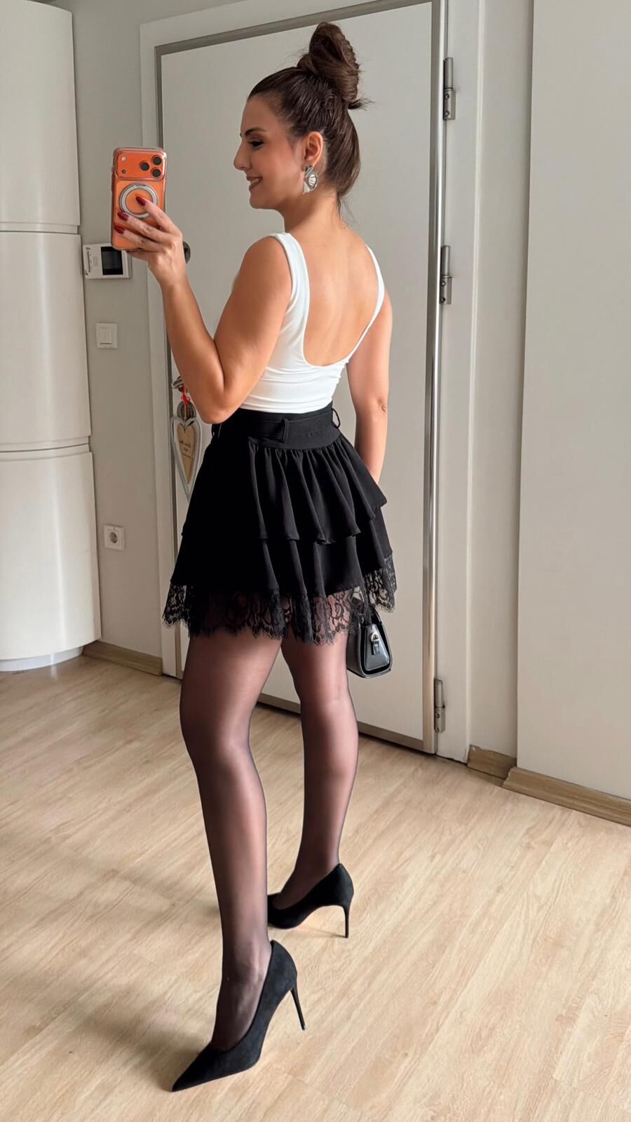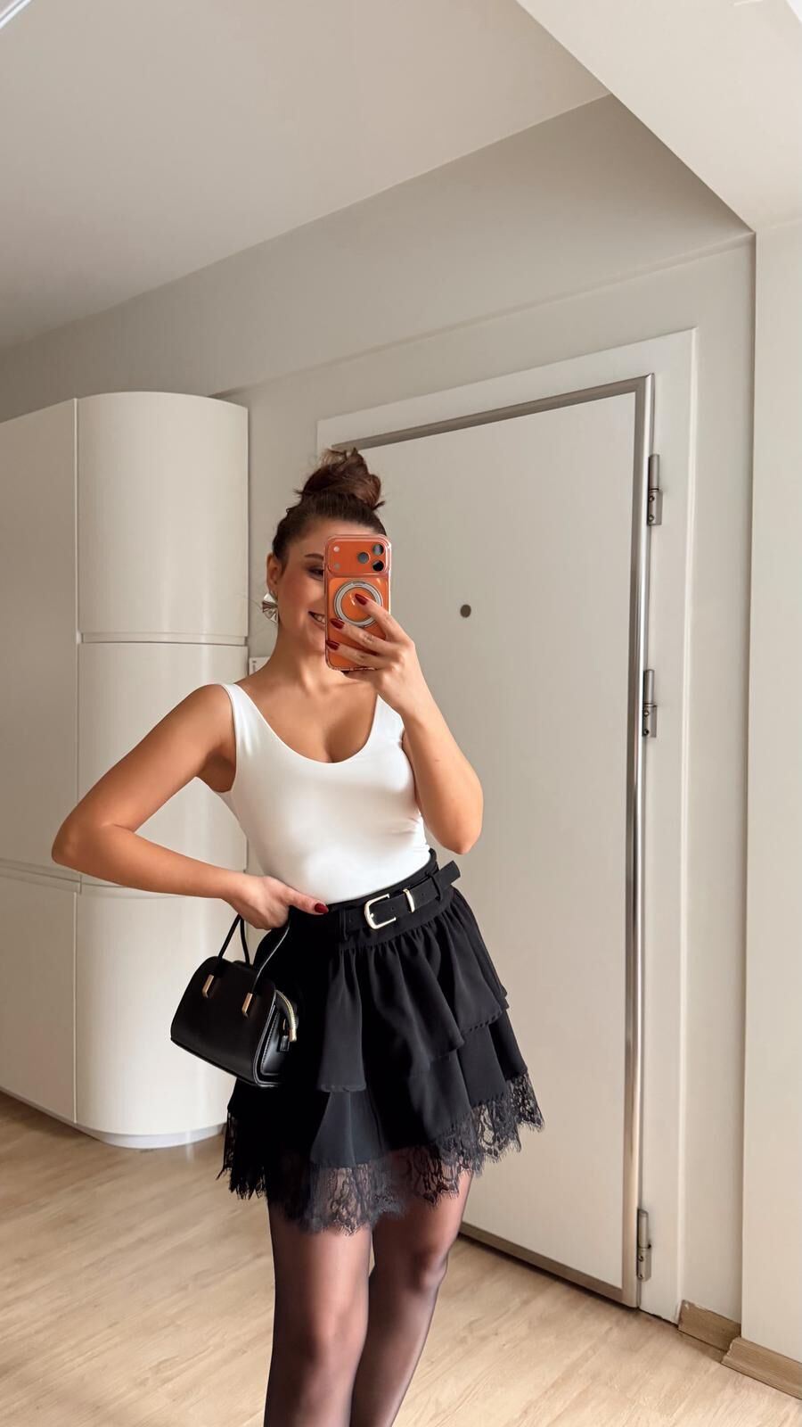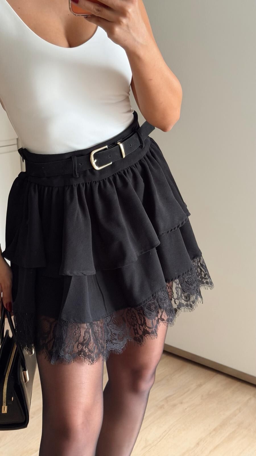 Kemerli Dantel Fırfır Etek Siyah