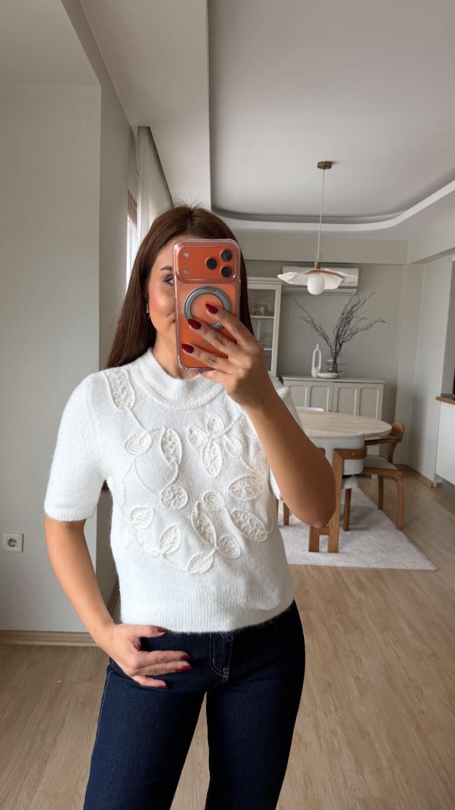 Kısa Kol Motifli Kazak Beyaz