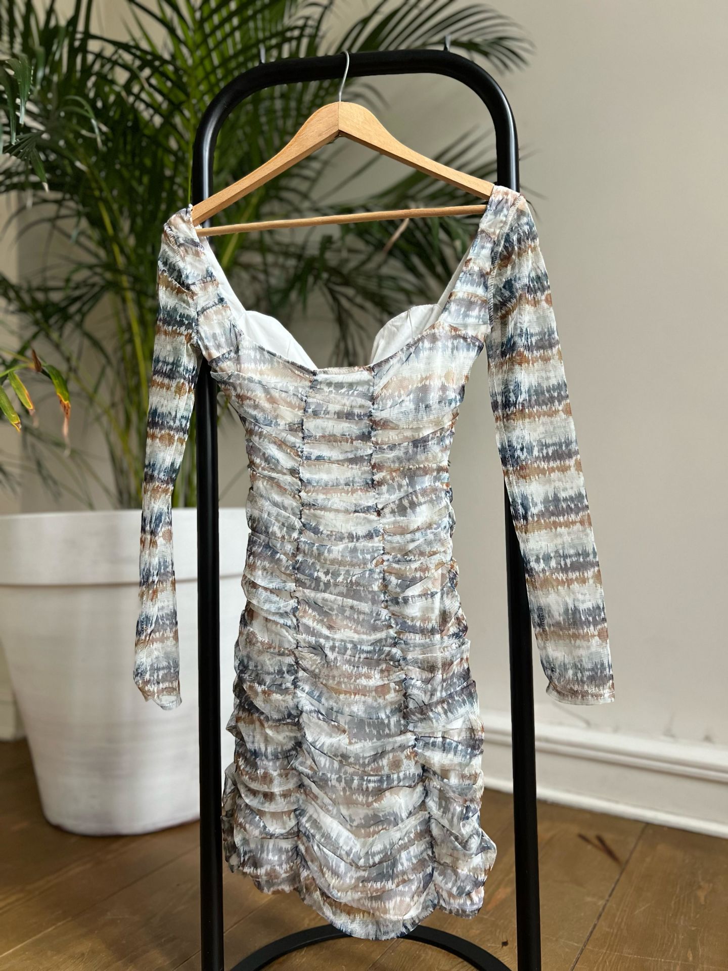 Mavi Desenli Şifon Drapeli Elbise