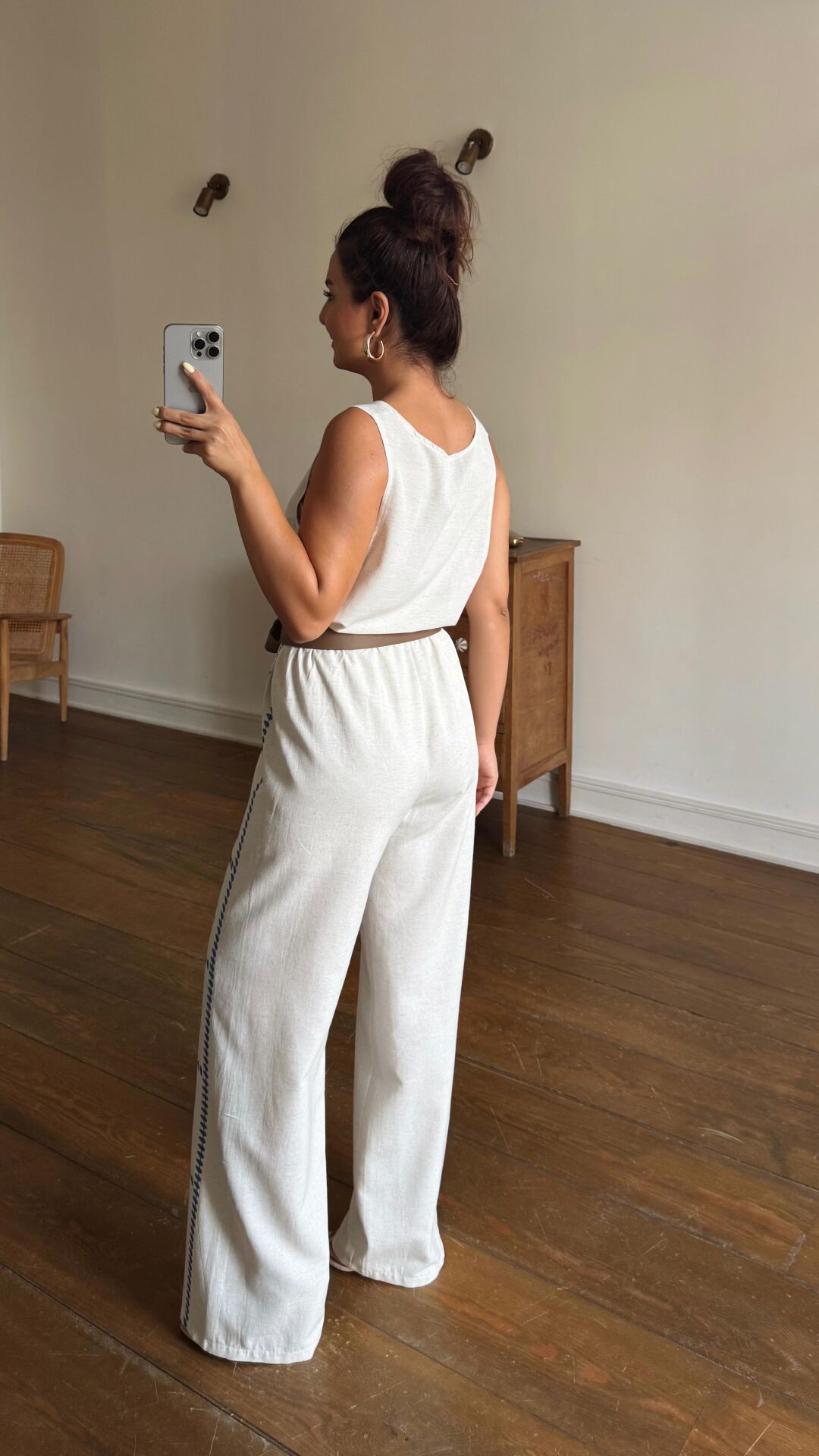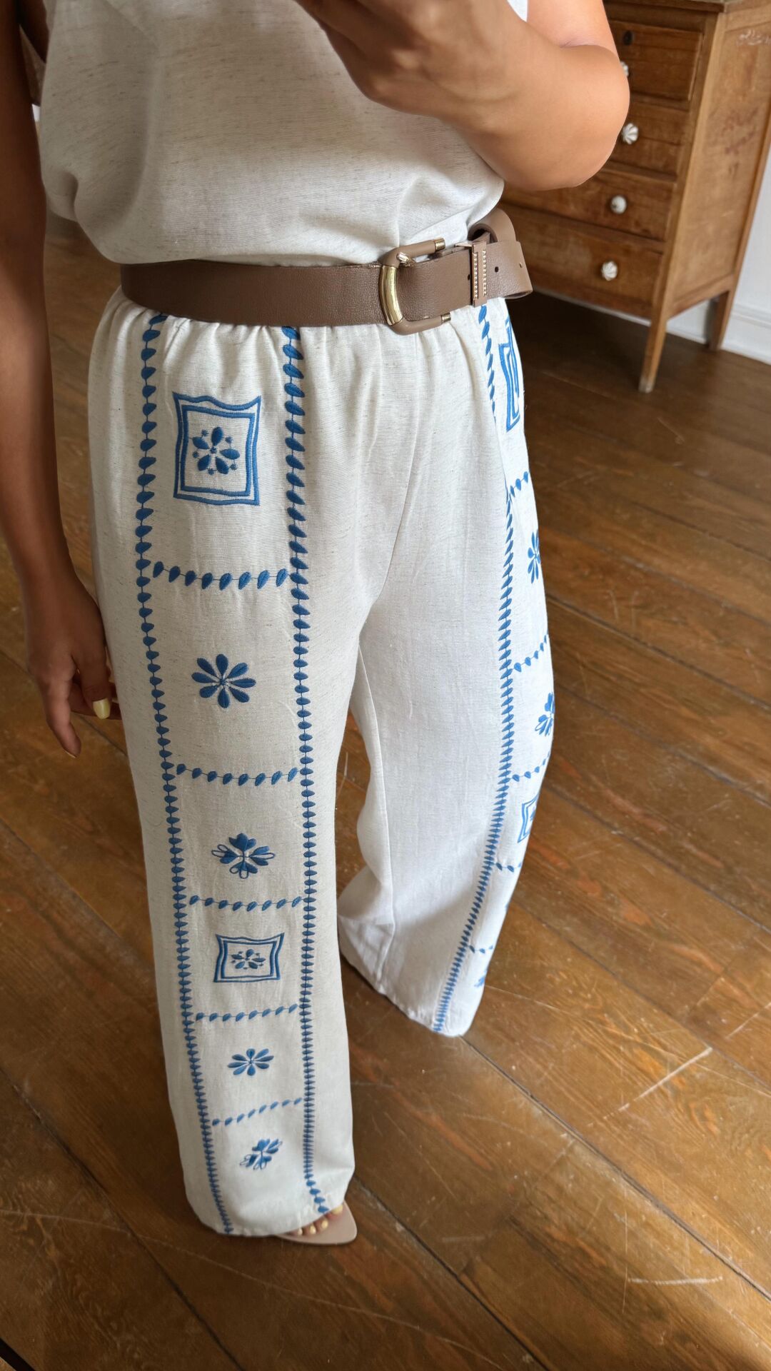 Mavi Nakışlı Keten Pantolon