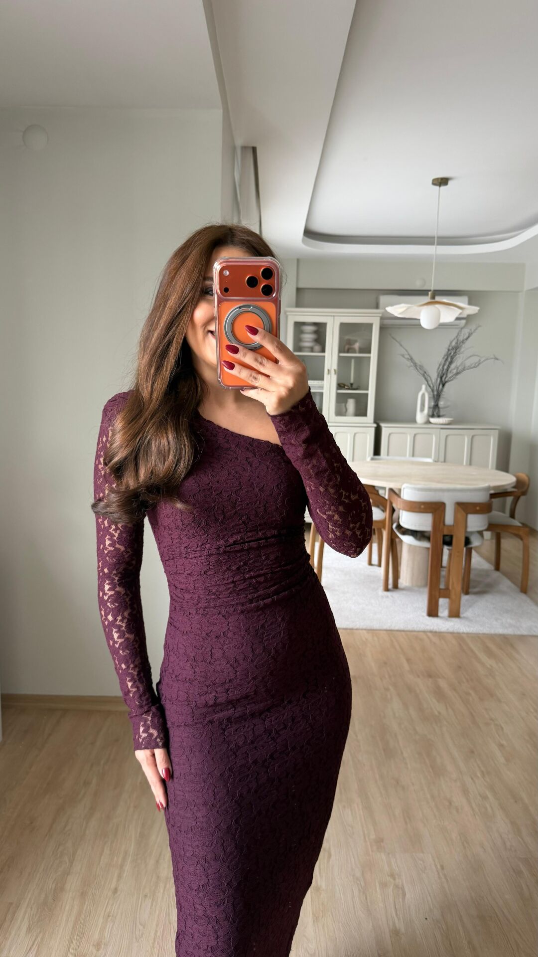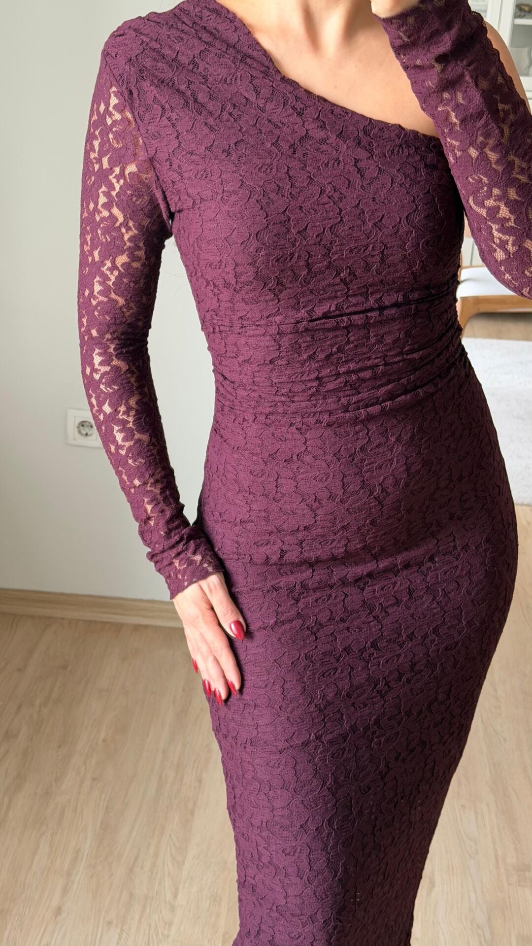 Tek Omuz Güpür Elbise Mürdüm